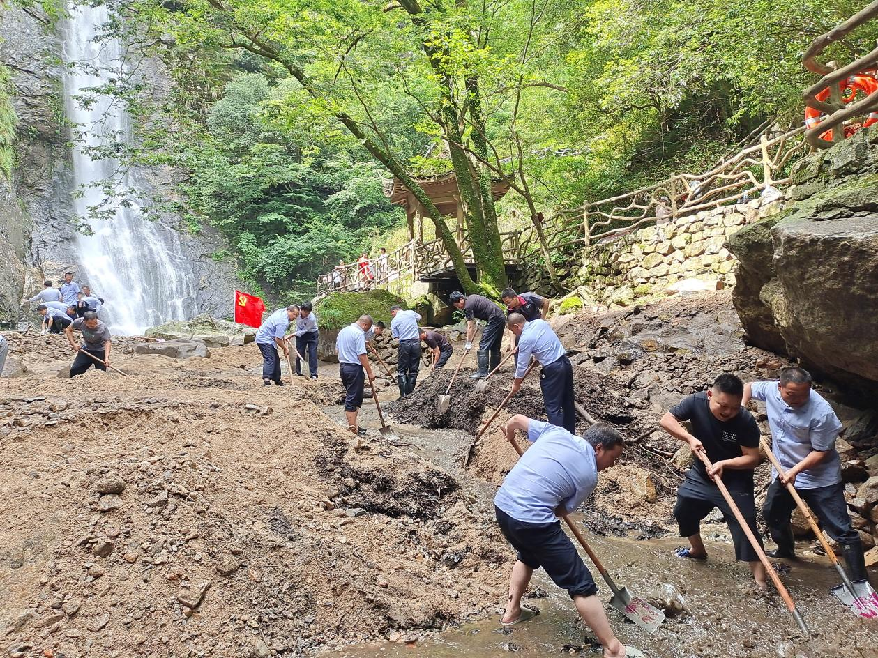 以学促干重实践,学以致用献力量。六月的天堂寨,景色优美,九影瀑更是有着“疑是银河落九天”的美丽景色,然而雨季来临,受雨水冲击导致九影瀑瀑布下仙女潭积沙严重,影响了游客观赏的满意度,为了确保景区美观以及给予游客更好的游玩体验。6月28日,天堂寨公司党总支组织开展“党建带团建”主题党团日活动,发扬传帮带精神,号召党员干部、团员青年带头,群众员工积极参与,对九影瀑瀑布下仙女潭,开展了砂石清理活动。清理现场,公司各部门积极配合,除保障公司正常运转员工外,党员干部、团员青年、群众员工齐上阵,大家分工合作,撸起衣袖,干劲十足,您一锹我一锹,忙的大汗淋漓,好多同志手磨出了血泡,但没有人叫累,充分发扬了不怕苦,不怕累的精神,经过一天的奋战,基本完成九影瀑仙女潭淤沙清理任务,又还现了一潭碧水。