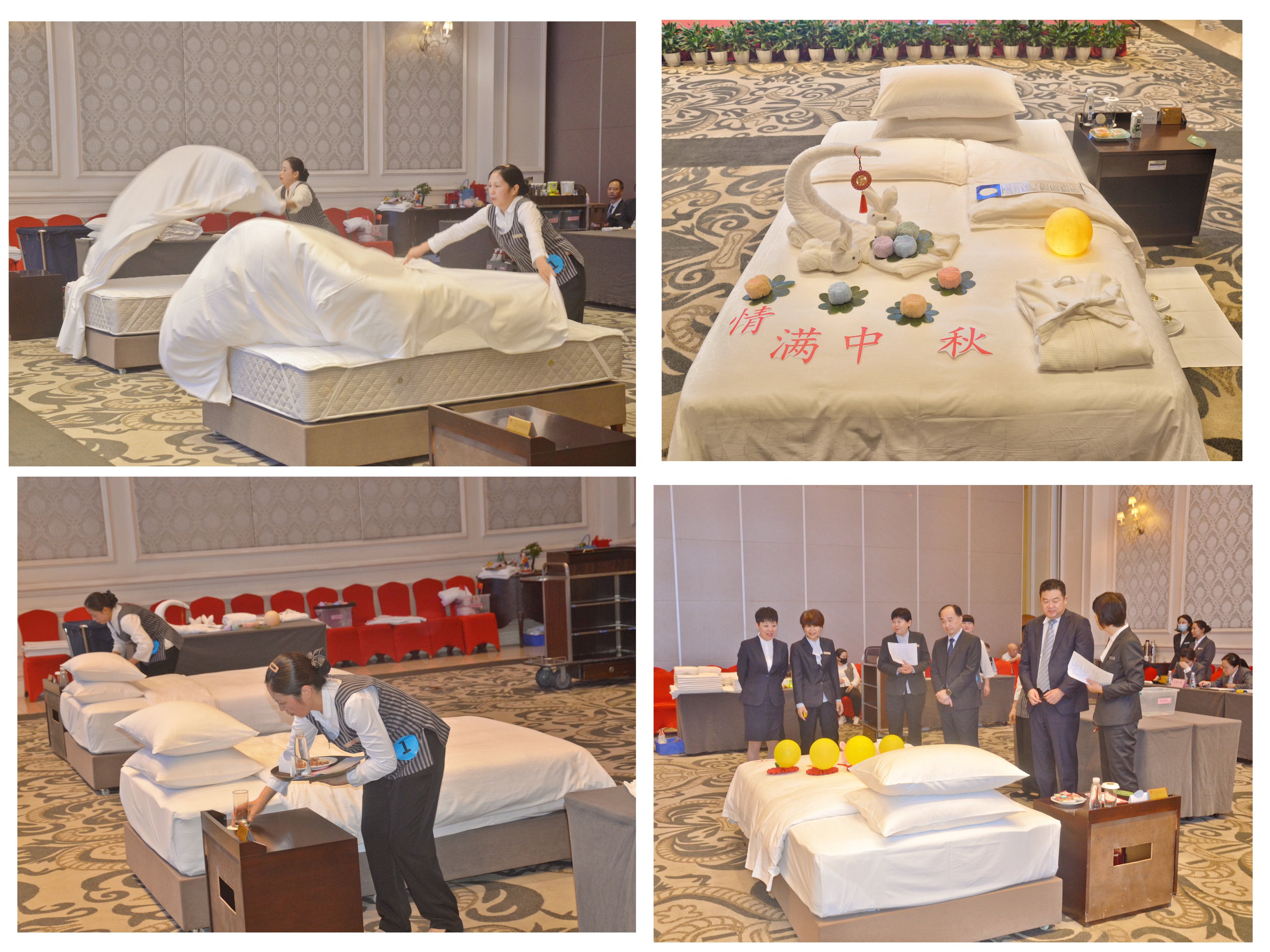 第一个比赛项目是客房服务??头渴潜隹驮诘晖A糇畛さ牡胤?,如何让宾客住的舒心至关重要。中式铺床是一切核心的基础,比赛中,选手们熟练地抛单、定位、包角、套被套等操作一气呵成,动作利落,整洁有序。此外,还进行夜床服务、酒店服务常见突发事件处理问答,测试选手们对客沟通技巧及应变能力??醋琶恳晃徊稳∈执匆馐闱胰萌松托脑媚康牟僮?,可以想象到她们在日复一日的工作中练就的专业水准。