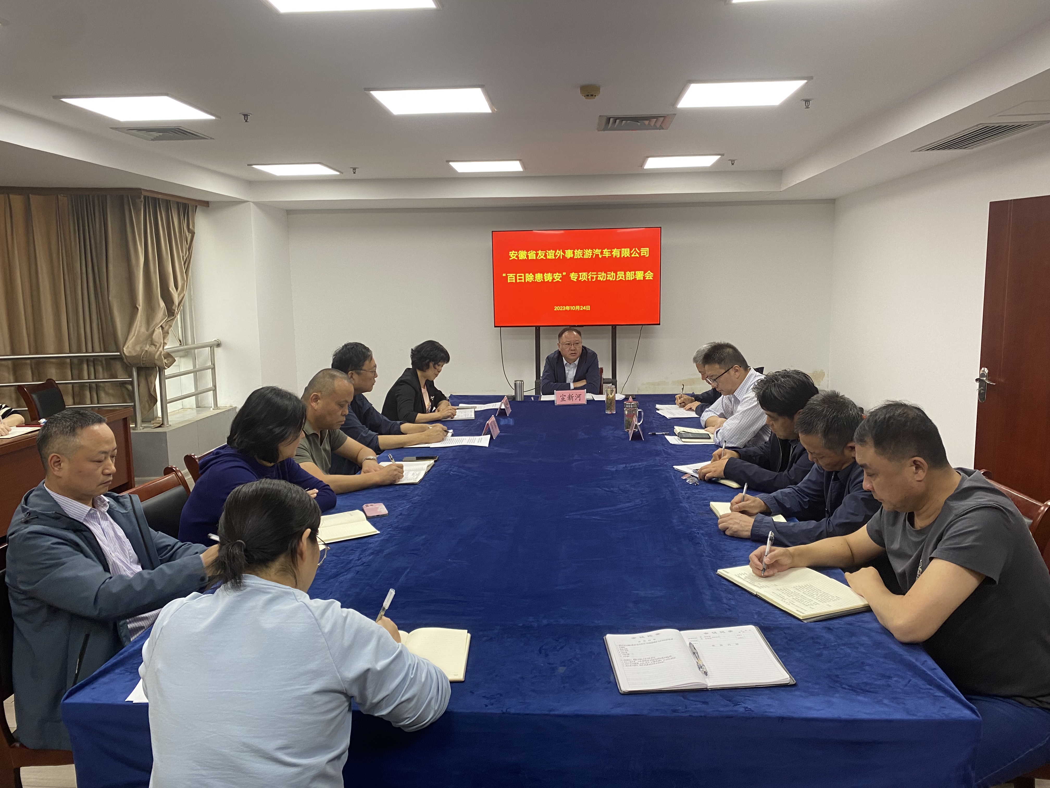 10月24日下午,安徽省友谊外事旅游汽车有限公司组织召开道路交通运输安全生产集中整治“百日除患铸安”专项行动动员部署会议。公司党支部书记、董事长宣新河作动员讲话,领导班子成员、各部门负责人及全体管理人员参加会议。