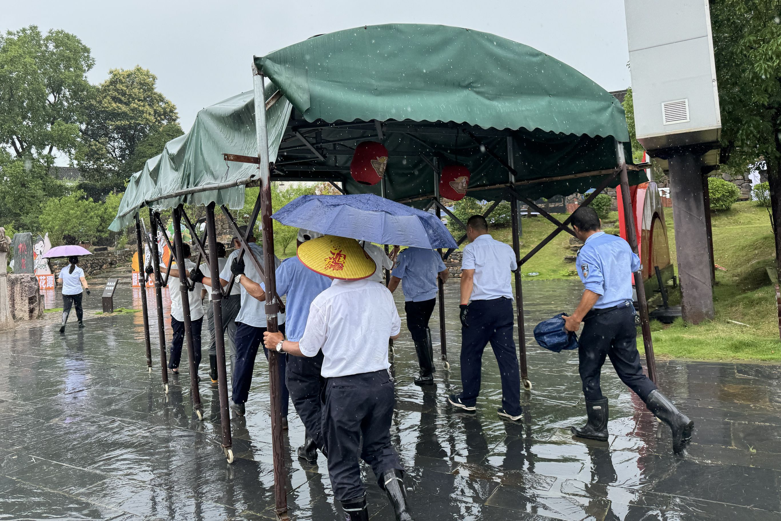 桃花潭景区党员干部连夜撤除多台空调外机,连续转移沿江遮阳棚、龙舟、竹筏、渡船等各类涉水相关设备至安全地带,及时拴牢加固踏歌广场木屋摊位、木屋售票亭及码头设施,做好上游陈村水库随时下令泄洪的应对工作,按照景区“防大汛”的要求严格落实保障旅游安全工作。截止6月23日,泾县公司根据安徽省防汛抗旱指挥部《指挥部令》和市、县地质灾害预警信息相关要求,及时对外公布所属桃花潭、江南第一漂景区暂停运营开放,并随时做好应对上游暴发洪水的有关工作准备。接上级通知上午11时,桃花潭景区上游陈村水库中孔全开预泄,发电继续保持满发。下午13时,水库全开溢洪道,持续加大泄洪流量,预计下泄流量将超过2000立方米每秒。