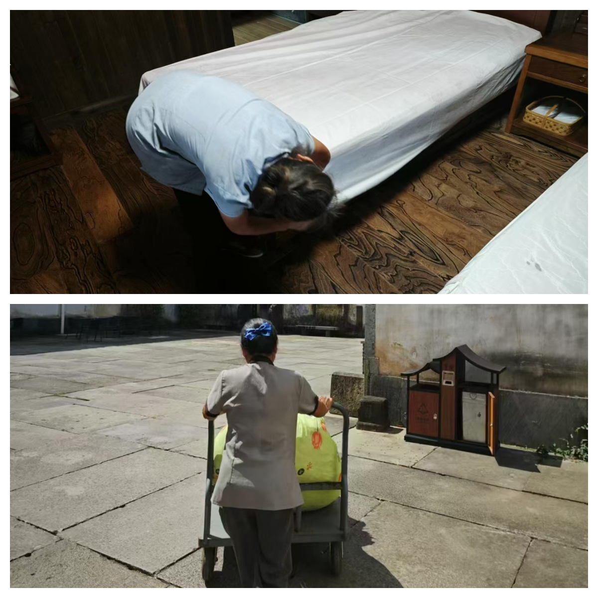 面对高温天气,七天井民宿客房前台24小时在岗,做好全面客房服务,保障住客入住质量??头看蠼忝且凰坎还兜刈龊每腿送朔亢蟮姆考湔碛肭褰喙ぷ?。一个个女员工用推车拉着上百斤的布草、独自抬起几十斤的床垫……被汗水浸湿的衣服是盛夏最美的剪影,温馨干净的客房让每位住客都感受到宾至如归。