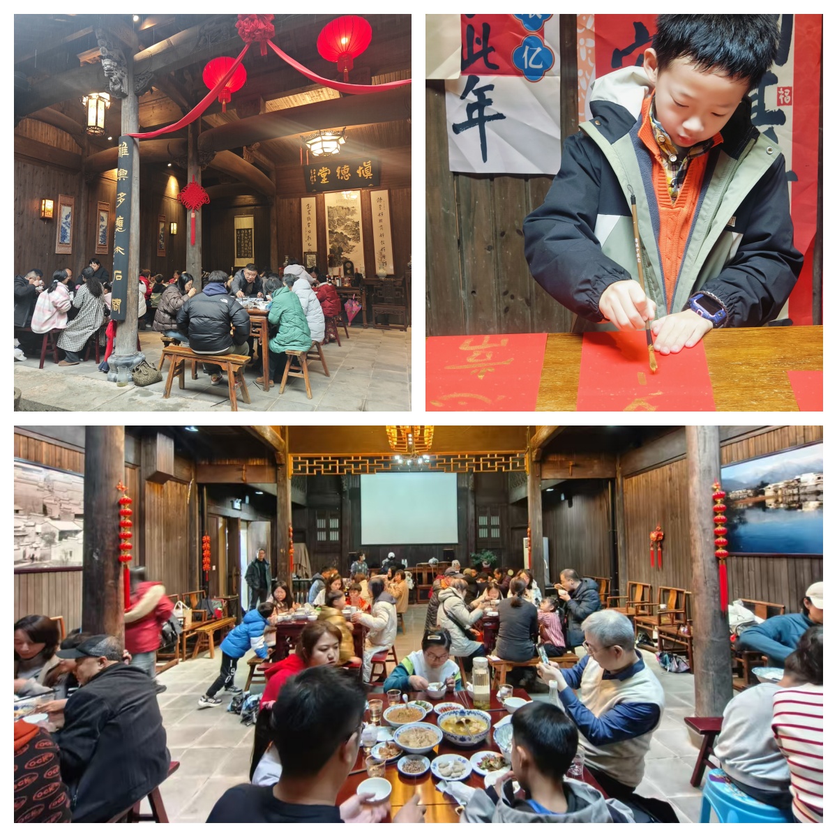 为让来自五湖四海的游客在唐模景区邂逅徽州传统年俗,感受浓浓的年味,唐模景区早早便开启了准备工作。工作人员全面清理景区环境,精心布置打卡点,新年氛围瞬间拉满。假日期间,景区内张灯结彩,热闹非凡。游客们穿梭其中,或是品尝特色美食,或是参与民俗活动,游客情绪热情高涨,处处欢声笑语。在悠悠云营地,投壶、蹴鞠等传统游戏引得游客纷纷驻足参与,大家在欢声笑语中感受传统国风游戏的魅力;在继善堂,游客们围聚在黄梅戏老师身边,饶有兴致地学唱黄梅戏,切身体验非遗戏曲的艺术魅力;在唐模乡村酒店,唐模特色“八大碗”让游客大饱口福,于舌尖感受唐模独特年味,饭后,游客们还可以亲手书写对联,体验书法艺术的魅力。丰富的节庆活动让到场的游客朋友们感受到了温馨而又热闹的传统年味,沉浸式感受传统徽州年俗的独特韵味,共度一个欢乐祥和的蛇年春节。