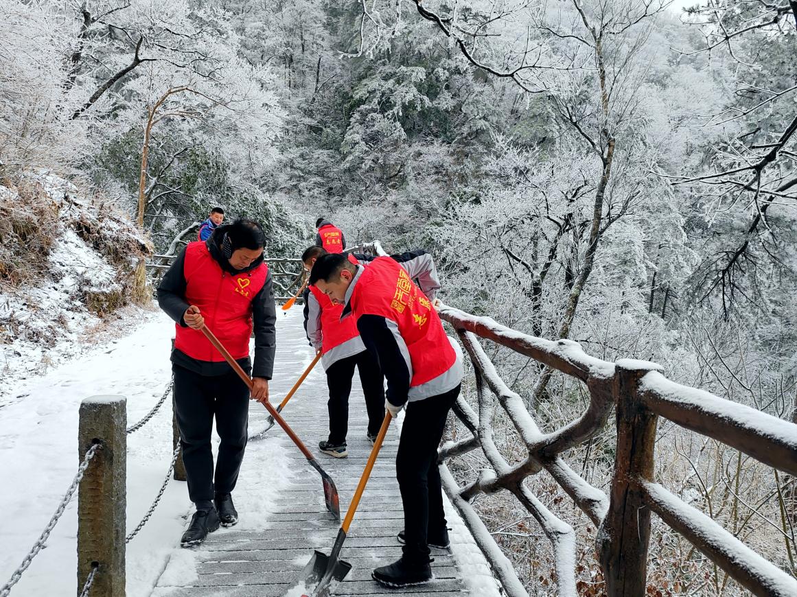 春节期间各景区严格落实24小时值班值守工作,在烟火年味中,维护了假日的祥和氛围。惊蛰时节,天堂寨景区突降雨雪,景区道路积雪结冰,景区以雪为令、迅速行动,组建除雪队伍分片区清理景区所有游步道积雪,并全面开展安全隐患排查整治,切实保障了广大游客游览安全。
