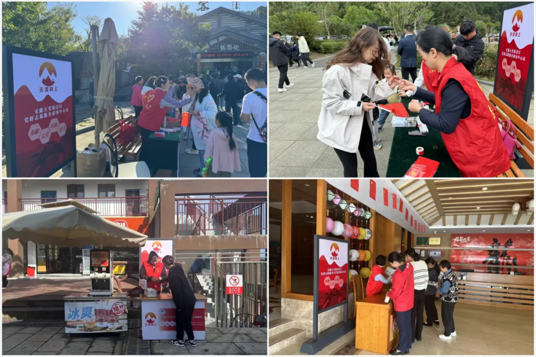 在天堂寨游客中心、索道站等核心区域,“党员示范岗” 的红色标识格外醒目。景区33名党员组建“天‘添’向上” 党群志愿服务队,设立5个党员责任区,形成“15 分钟服务圈”。党员志愿者化身“多面手”:在检票口,他们是秩序维护员,引导游客快速通行;在观景台,他们是安全巡视员,提醒游客注意脚下安全;在休息区,他们是暖心服务员,为老人提供轮椅、为儿童提供免费饮水。