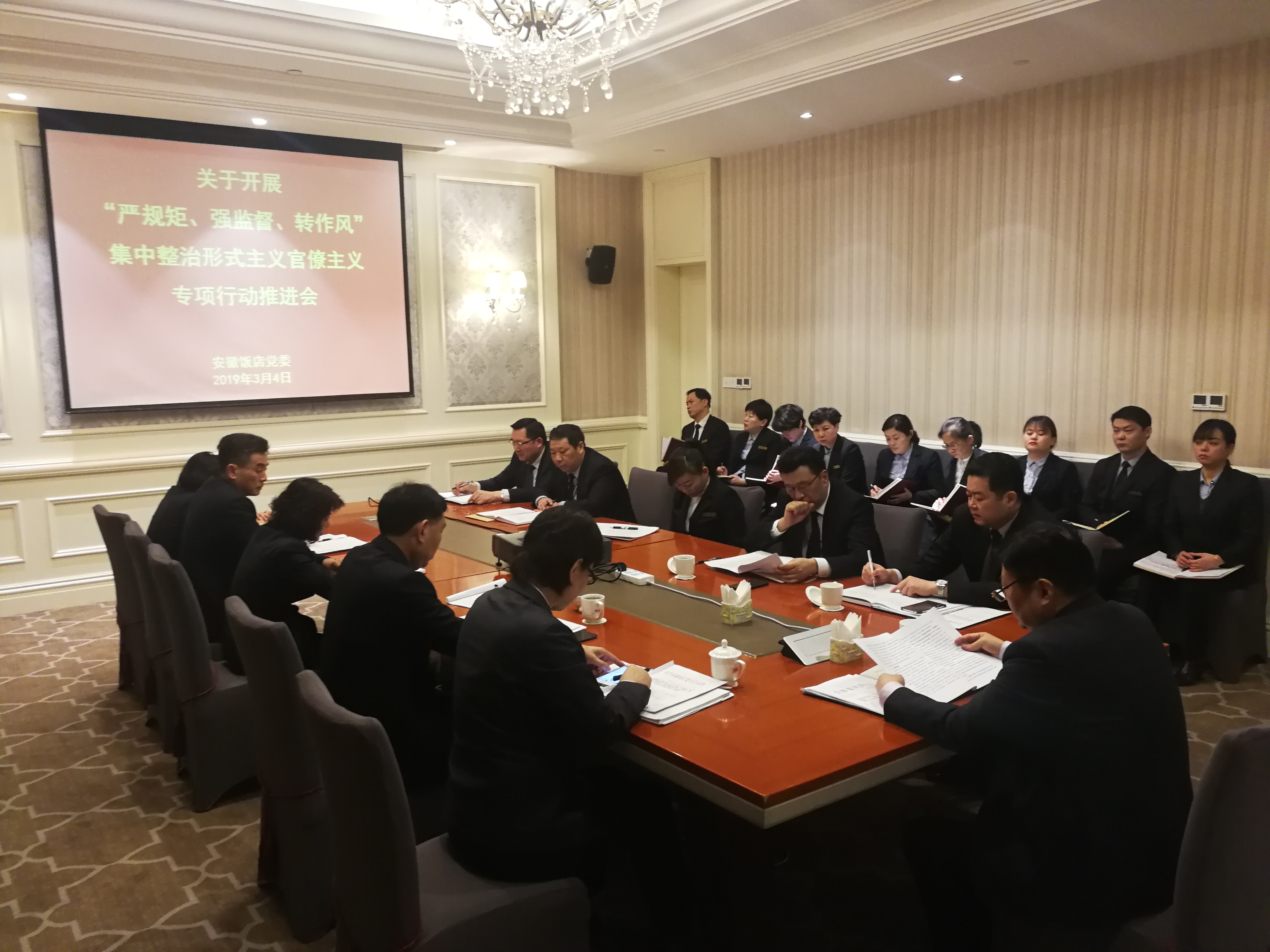 3月4日上午,安徽饭店党委召开“严规矩、强监督、转作风”集中整治形式主义官僚主义专项行动部署推进会,全面动员部署集中整治专项行动?;嵋橛煞沟甑澄榧恰⒍鲁?、总经理龚林主持,饭店党委领导班子成员、各支部书记、全体中层管理人员、见习经理等参加会议。