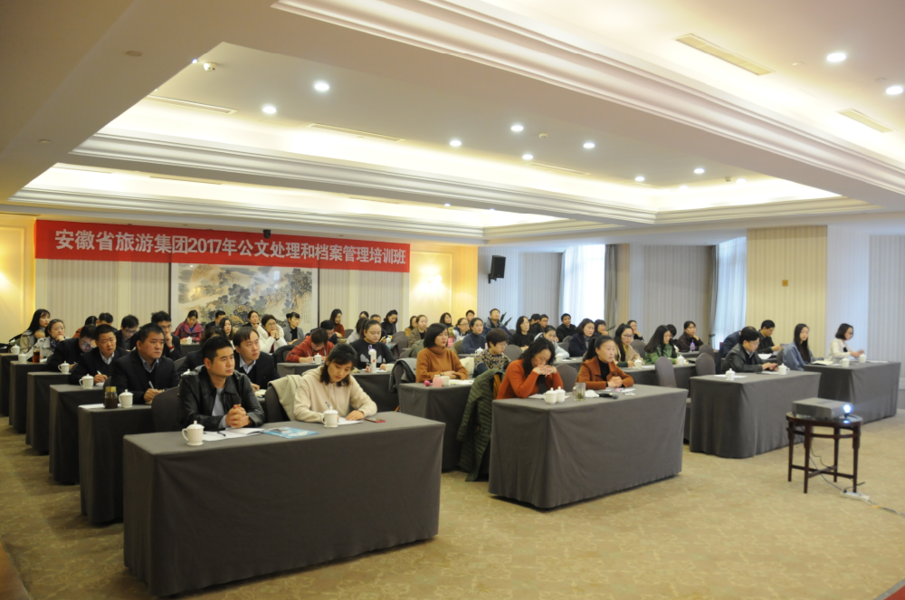 为进一步提升全集团档案管理及公文写作能力,增强新形势下办公室(综合部)工作的业务能力和综合素质,按照省旅游集团年度工作计划安排,2017年12月7日,集团公司综合部在安徽饭店举办了“安徽省旅游集团档案管理和公文写作培训班。集团所属各公司办公室(综合部)主要负责人和负责公文、档案等具体业务的工作人员,以及集团本部各部门负责公文处理、档案管理方面的工作负责人及兼职收文员、兼职档案管理员,共计62人参加了本次培训。