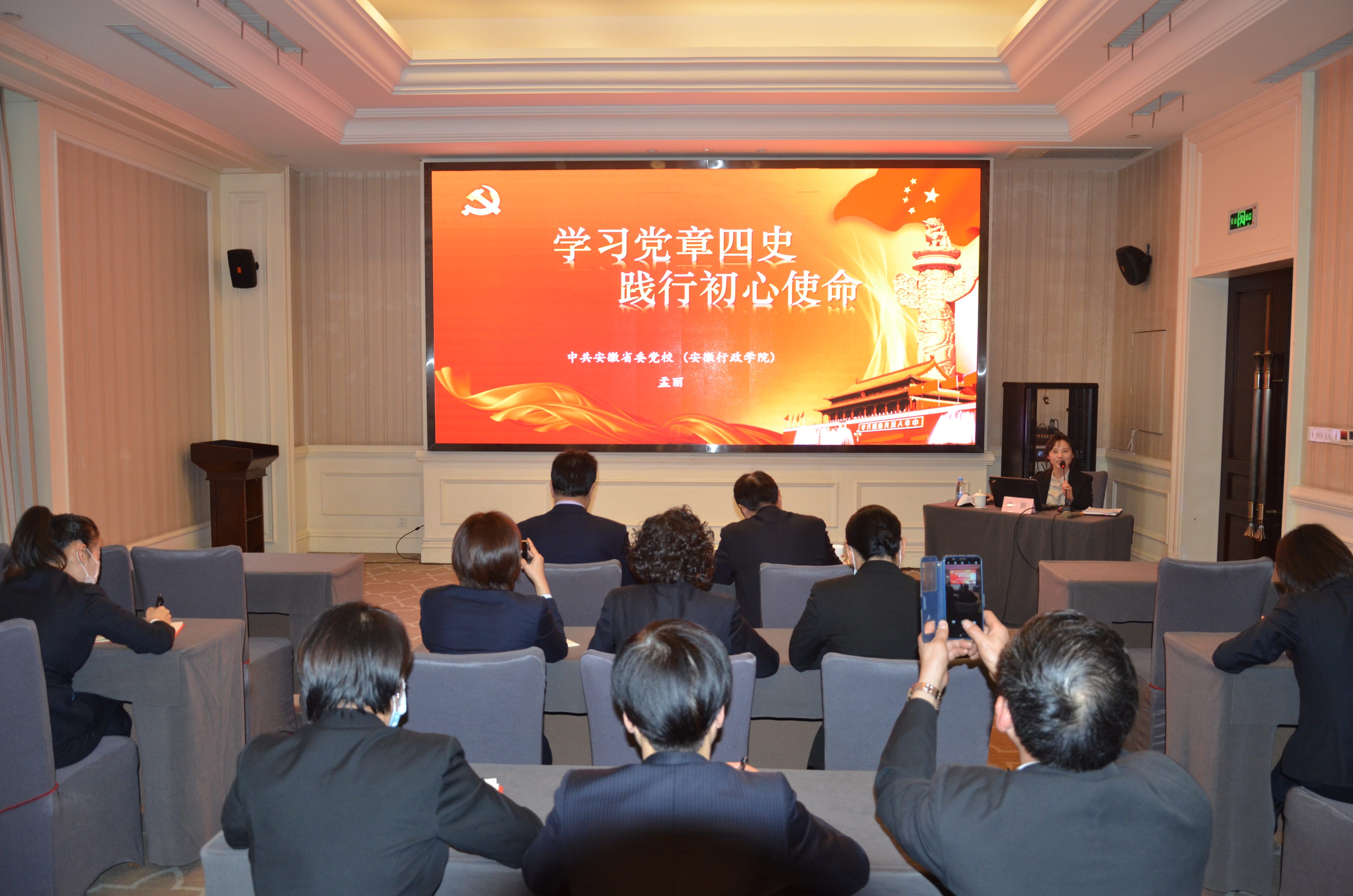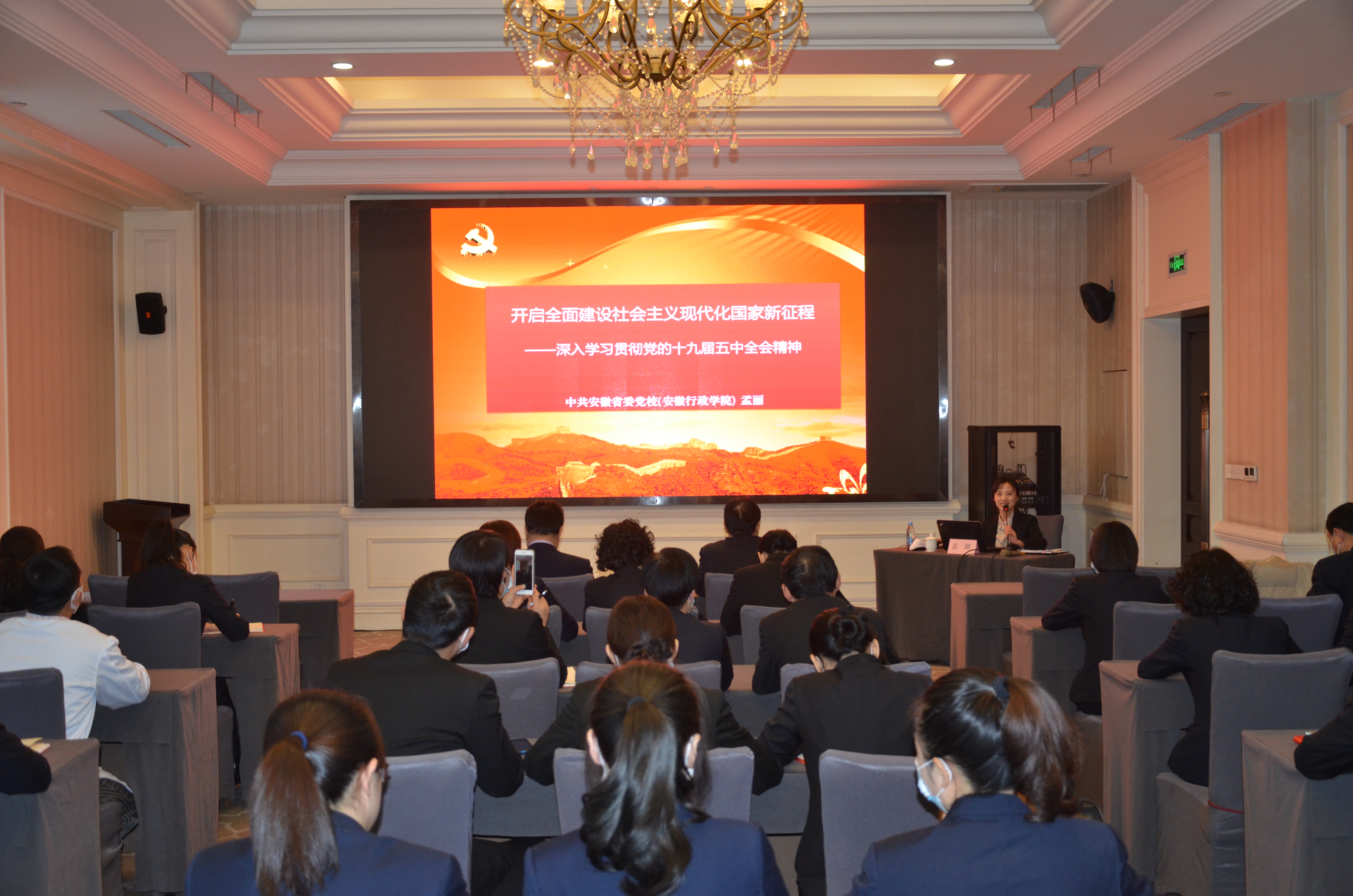 此次活动,饭店专门邀请了中共安徽省委党校(安徽行政学院)副教授孟丽同志到店开展授课。孟教授以《开启全面建设社会主义现代化国家新征程》为主题,从“党的十九届五中全会的重大意义”、“决胜全面建成小康社会取得的决定性成就”、“牢牢把握2035年远景目标和“十四五”发展目标”等五个方面,全面深入的解读了党的十九届五中全会精神。以《学习党章四史,践行初心使命》为课题,深刻阐述了党章的功能定位、十九大党章修改的主要内容、党章的结构、学习和遵守党章的基本要求,进一步强化学习遵守党章,增强党员思想意识;围绕“党史、新中国史、改革开放史、社会主义发展史”,深入论述坚持学习四史,是思想建党、理论强党的必然选择的重要意义。