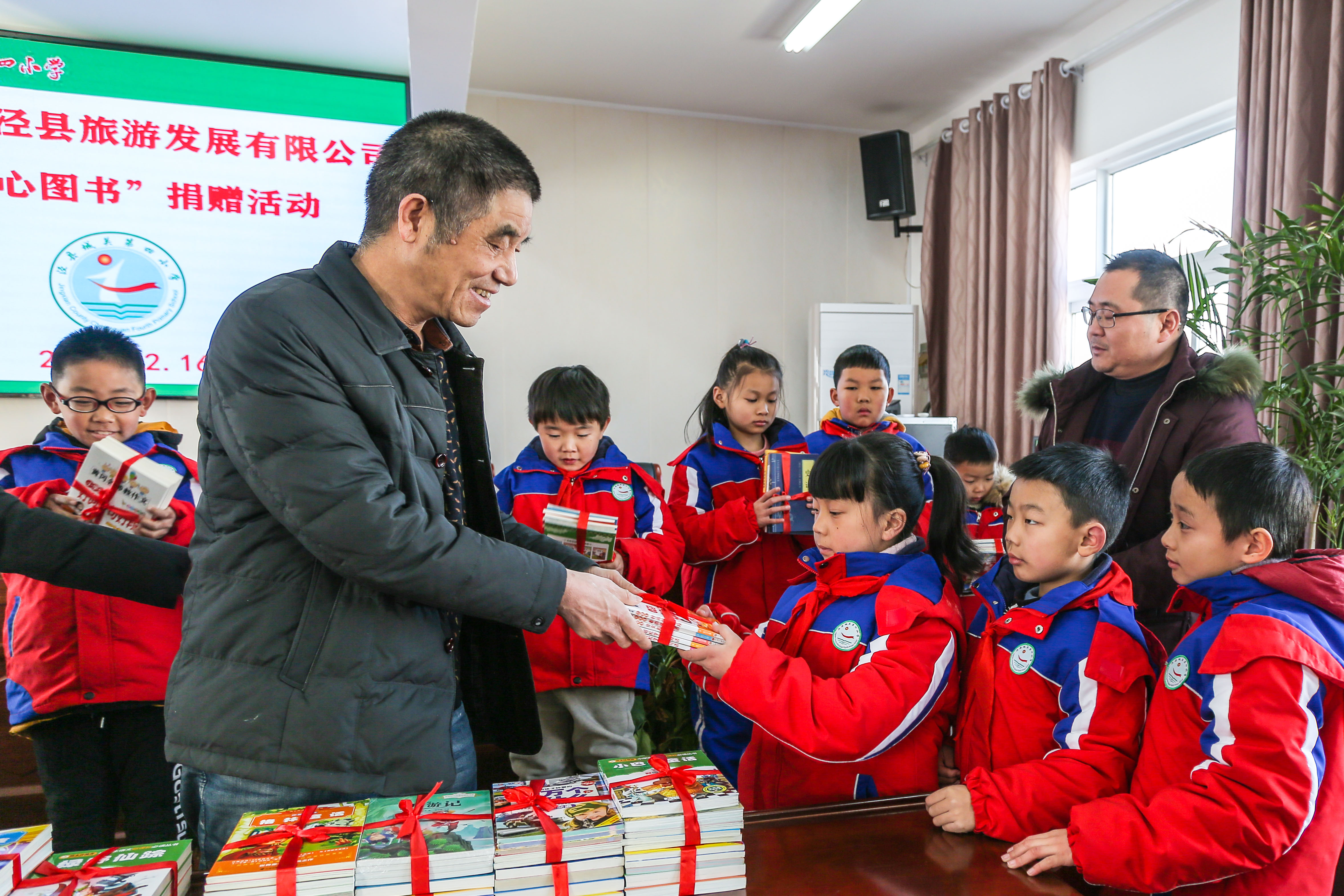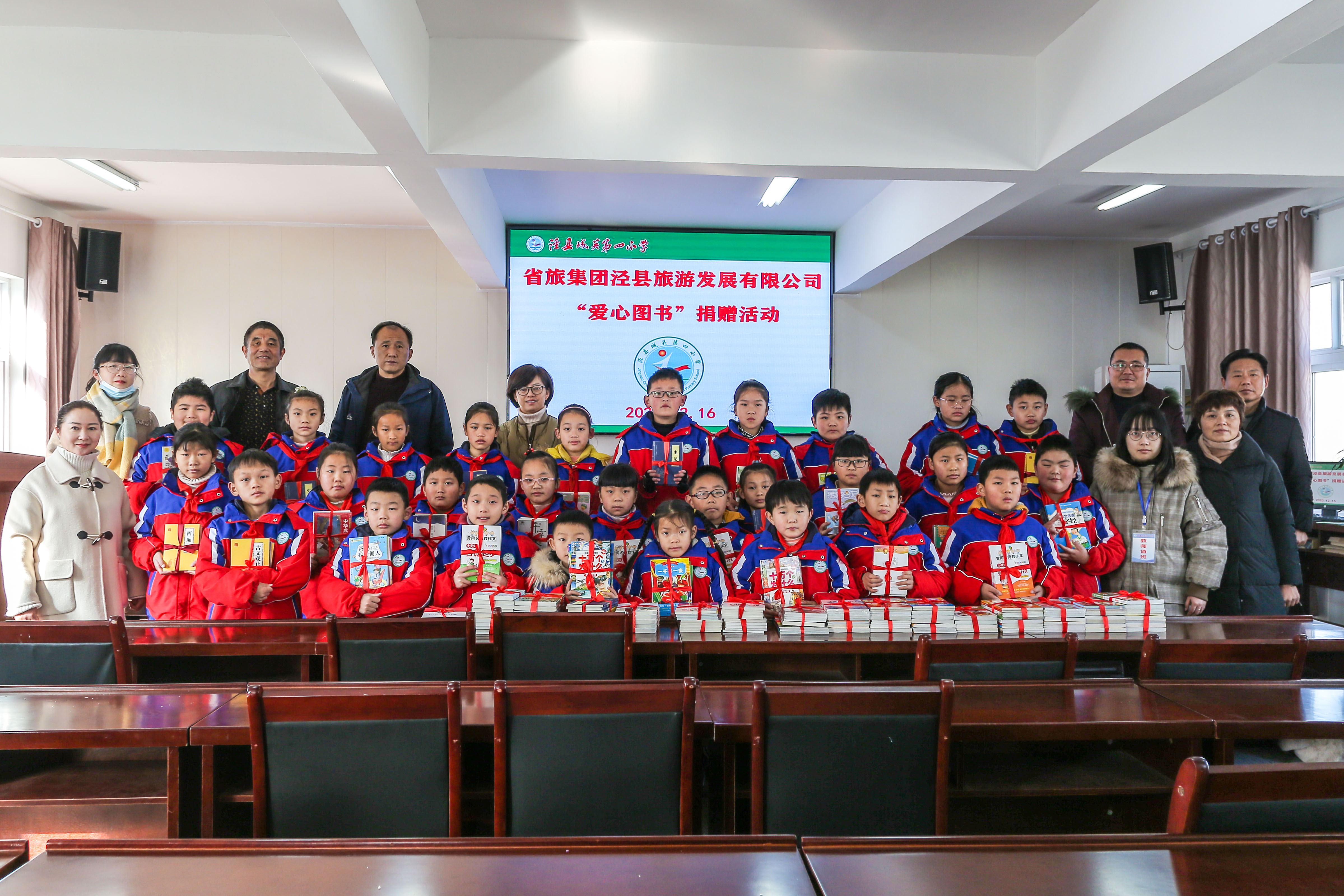 知识启迪梦想,爱心孕育希望。 12月16日上午,泾县旅游公司支委委员、副总经理刘莫虚、工会副主席王越、团支部副书记黄慧敏等一行专程赶赴泾县城关第四小学,给学校的贫困生们送去了丰富的精神食粮——图书。此次爱心图书捐赠活动由泾县旅游公司团支部主办,泾县城关第四小学校长许震等相关领导、新闻媒体及28名受助贫困生参加了捐赠仪式。