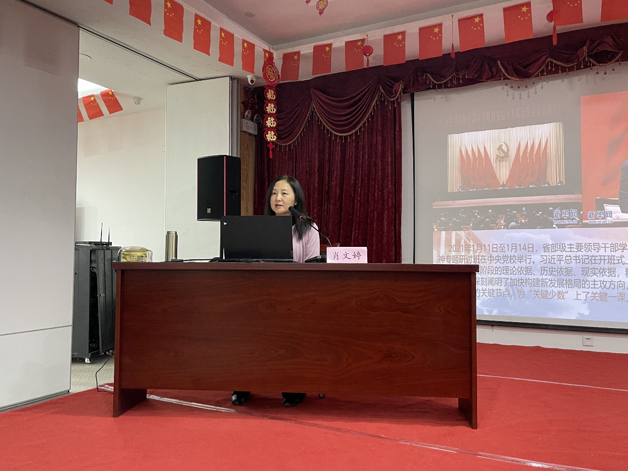 宣讲会上,肖文婷围绕充分认识党的十九届五中全会重大意义、全面把握“十四五”《建议》的丰硕成果、以青春之我建设现代化之中国三个方面,详细阐述了党的十九届五中全会精神的深刻内涵和重要意义,对党的十九届五中全会精神进行全面宣讲和深入解读。
