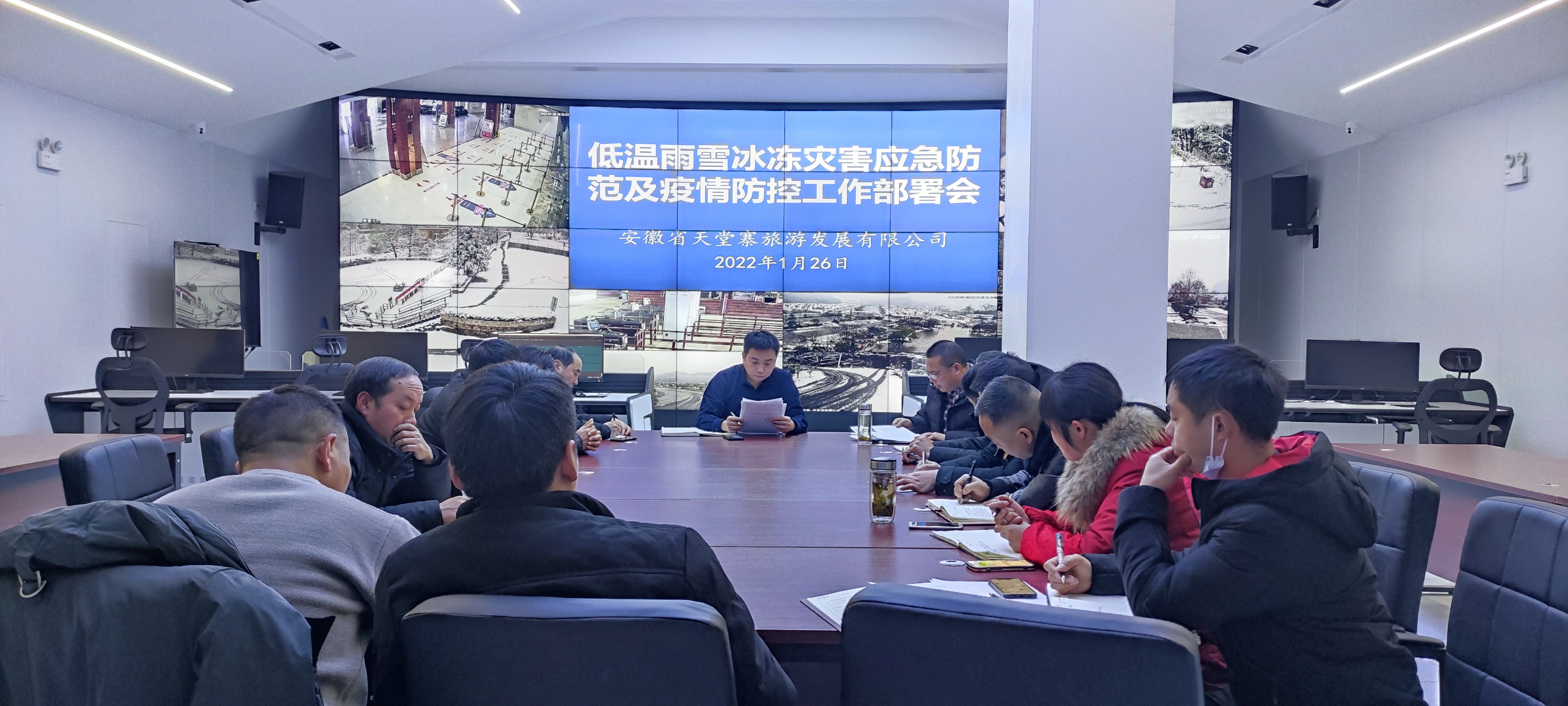 为积极应对和有效防范低温雨雪冰冻灾害, 1月26日下午,受天堂寨旅游发展公司党总支委员、执行董事、总经理汪杰锋委托,公司党总支委员、副总经理张斌主持召开了天堂寨景区低温雨雪冰冻灾害防范应对及疫情防控工作部署会,统筹安排防寒防冻和疫情防控工作,公司各部门及关键节点值守负责人参加了会议。