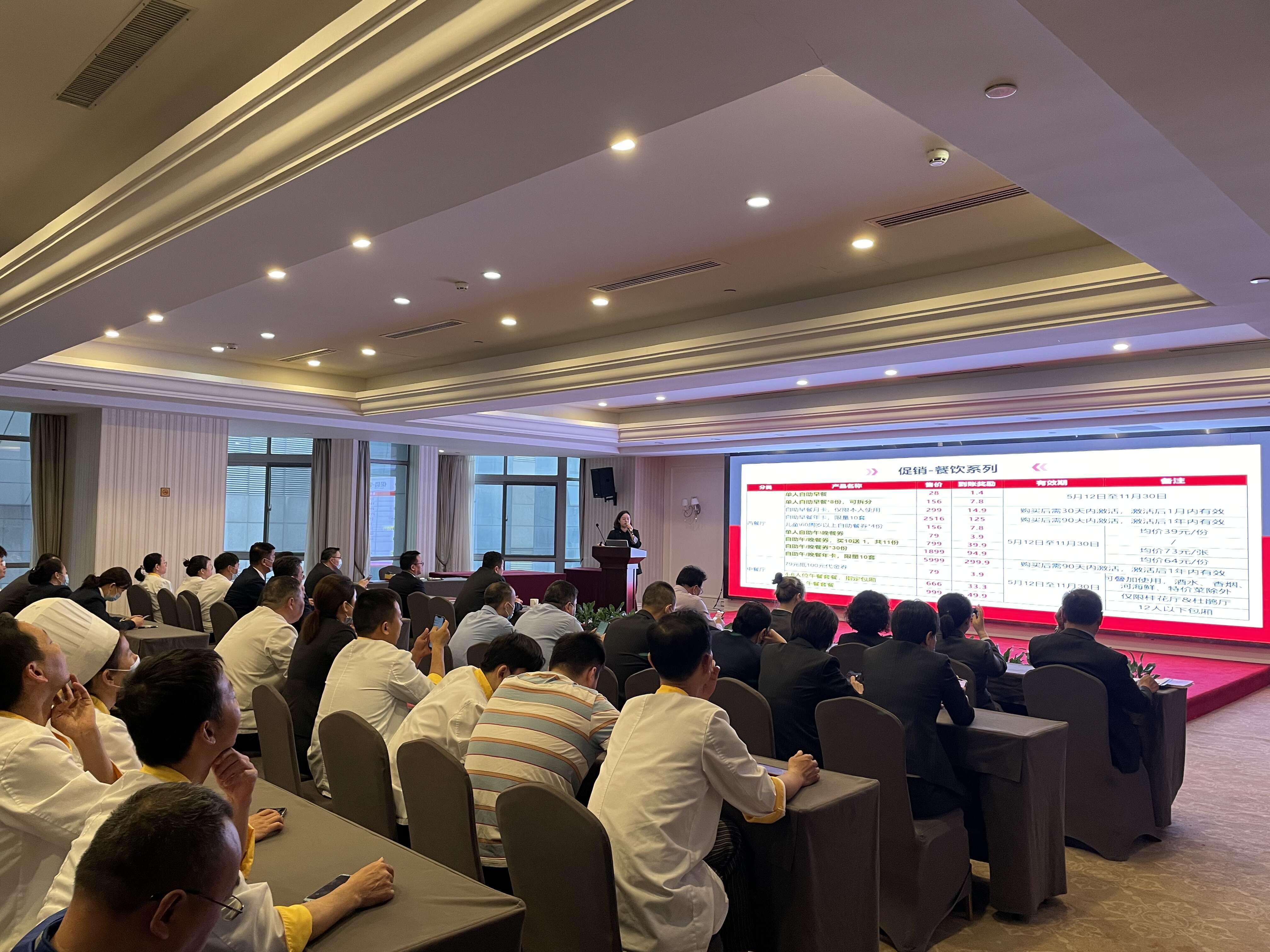 本次活动产品促销方案,从前期策划到确定产品,再到细则制订,并协同直客通运营团队进行多次探讨,反复斟酌,并形成最终促销方案。为使员工尽快了解活动产品,掌握线上营销技巧,5月11日下午,饭店组织全体员工开展了两场“5.16”店庆大促专题培训。同时,在培训会上,合作单位北京直客通科技有限公司对去年开展的“双十一”大促取得的成绩进行了总结,饭店荣获第四届直客通杯数字化营销华中区百强商户奖项。