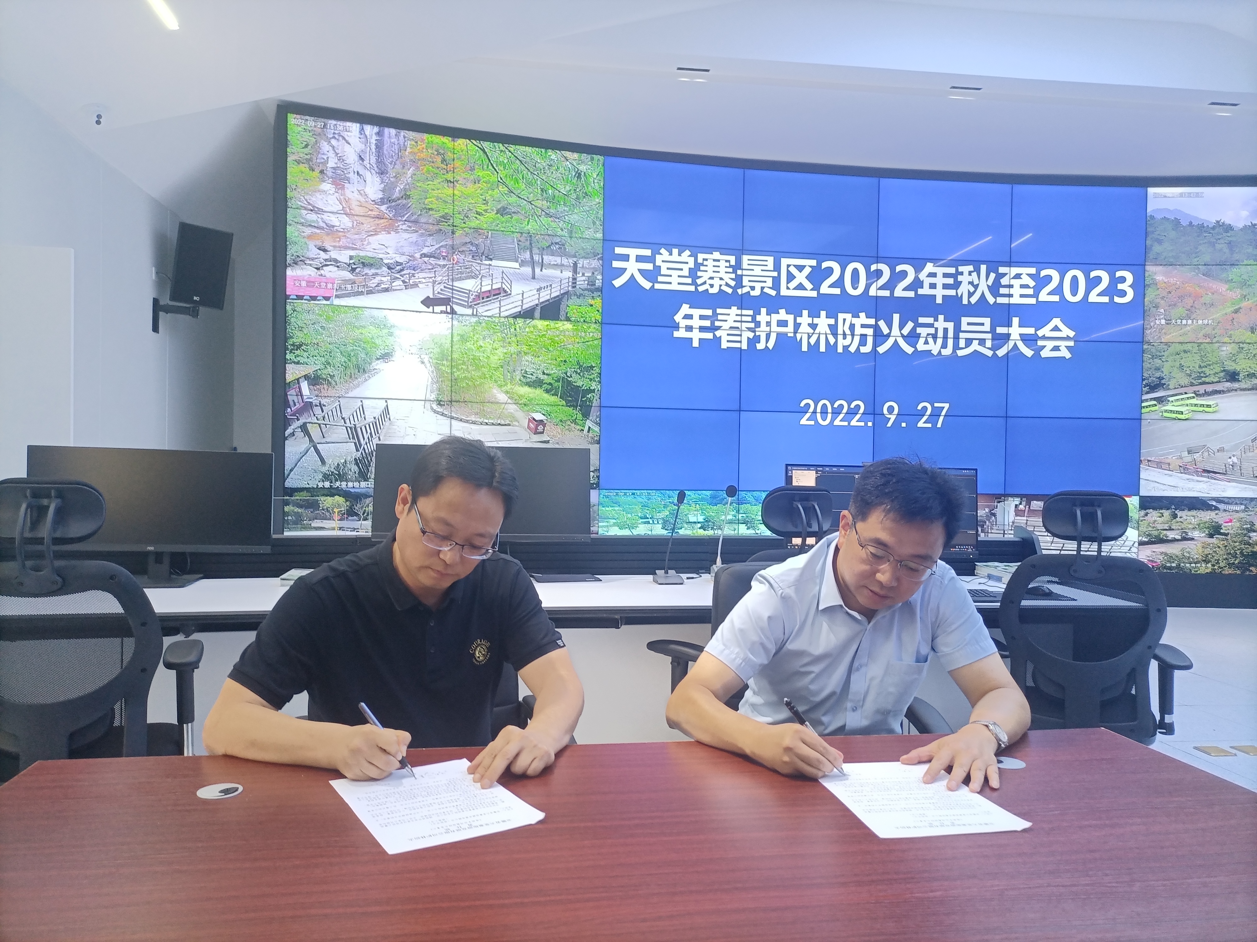 在随后召开的天堂寨景区2022年秋至2023年春护林防火动员大会上,会议对《天堂寨旅游发展有限公司2022年秋至2023年春护林防火工作方案》进行了宣贯解读,并就今秋明春的护林防火工作进行全面的安排部署。随后,公司总经理汪杰锋与分管安全的副总经理张斌签订了防火责任状,分管安全的副总经理张斌与十个责任片区负责人分别签订了防火责任状。