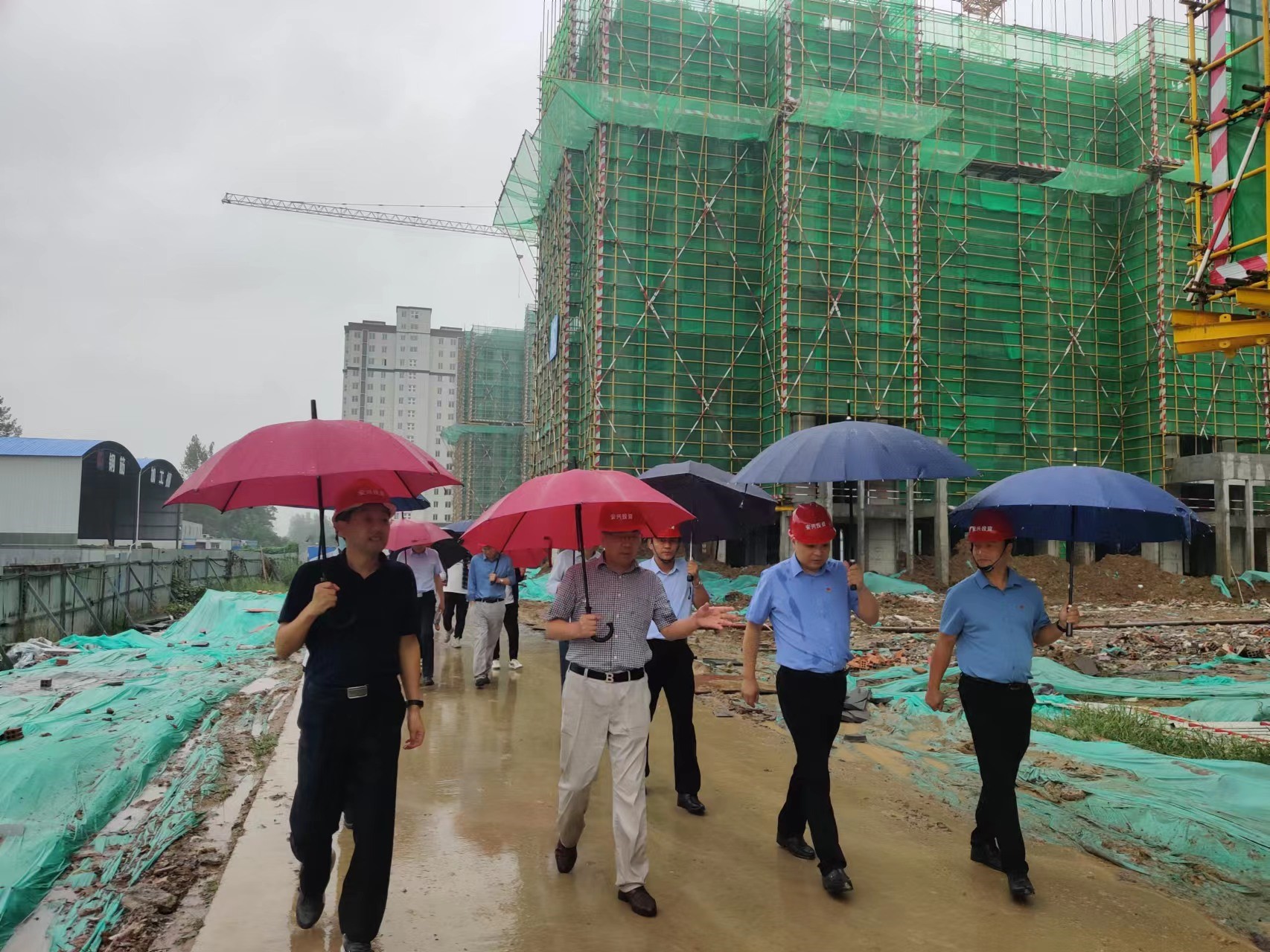 郑承乾一行冒雨赶赴淮北安兴古镇文化旅游开发有限责任公司隋唐运河古镇项目现场、淮北安兴投资有限公司相湖春晓项目施工现场,详细察看了项目施工进度,重点就加强安全生产管理和质量管控等工作提出了督导意见。