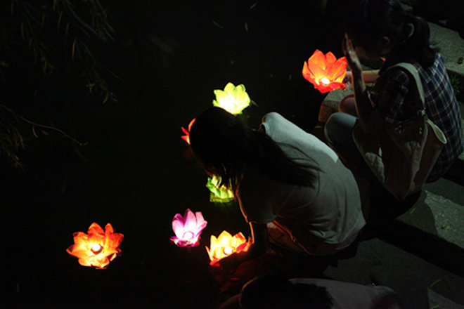 水街两岸,熙熙攘攘,人们手鞠一盏河灯,小心翼翼,满怀虔诚,轻轻点燃后放进溪中。微风拂来,各色的小河灯飘飘荡荡,顺流而下,发着微光,穿桥过洞,映照着两边的青苔石阶,斑斓陆离;它承载着无限的祝福、思念和留恋,飘向远方,好似夜空的繁星。